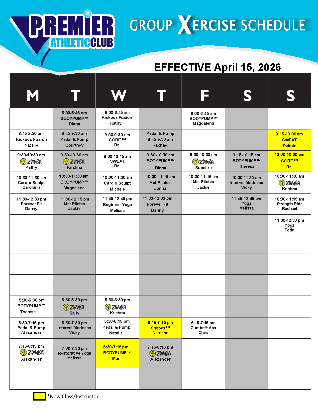 Premier Athletic Club offers a variety of group exercise classes, available for every age and stage of fitness! From heart-pumping cardio to the rhythmic flow of yoga, there’s something for everyone, including our senior members.